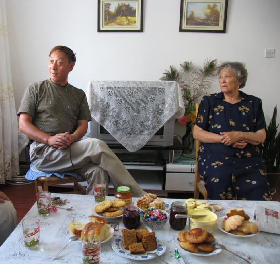 到俄罗斯族人家中作客或办事,进屋要敲门,得到允许才能入内,进屋要脱帽,坐在主人让给的位子上,不能坐床,坐床认为是很不礼貌的行为。来客不得随便吸烟,吸烟须经主人同意。俄罗斯人最隆重的传统礼节是用面包和盐迎接客人,象征着友谊和善意。来客须用刀子切下一块面包沾少许盐吃下后方可进屋。这种礼节从前只用于迎接贵宾和新娘,现在也用于一般社交场合。