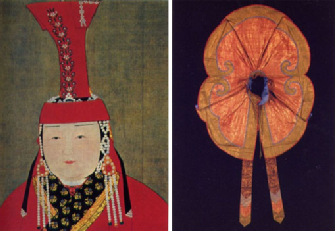 蒙古“固姑冠”是元代蒙古族已婚女子流行的高冠。在《蒙古秘史》中蒙古语称“孛黑塔”,汉文史籍也称罟罟冠。此头冠,一般采用桦树皮围合缝制而成,呈长筒形,高约1尺,顶部为四边形,上面包裹着五颜六色的绸缎,缀有各种宝石、琥珀、串珠、玉片及孔雀羽毛、野鸡尾毛等装饰物,制作精美,绚丽多姿【图为察必皇后(罟罟冠)与元代金丝(纳石失)披肩,编者搜集】。