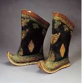 蒙古人爱穿靴子,蒙古靴分布靴和皮靴两种。布靴多用厚布或帆布制成,穿起来柔软、轻便。皮靴多用牛皮、马皮或驴皮制成,结实耐用,防水抗寒性能好。其式样大体分靴尖上卷、半卷和平底不卷的三种,分别适宜在沙漠、干旱草原和湿润草原上行走。蒙古靴做工精细考究,靴帮、靴靿上多绣制或剪贴有精美的花纹图案【图为蒙古族民国时期贴花纳底翘尖牛皮男靴,中央民族大学民族博物馆馆藏】。