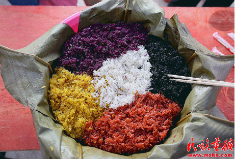 南方稻作民族将糯米用紫蕃藤、黄花、枫叶、红蓝草等泡染后再蒸煮出红、黄、黑、
