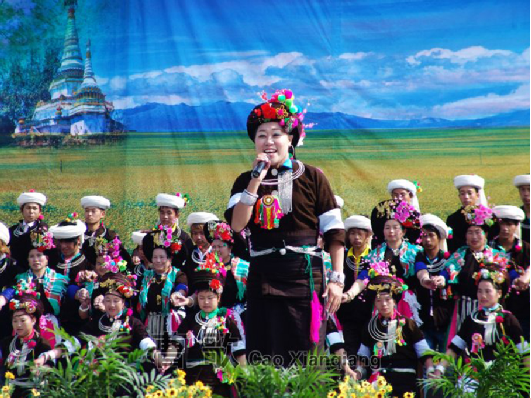 阿昌族歌手张月在中国陇川阿昌族阿露窝罗节日开幕式上演唱。曹歌摄(2012)