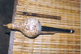 阿昌族的乐器主要有竹琴、洞箫、葫芦箫(右图,刘军摄)、三月箫、铜口弦、三弦、象脚鼓(下图,蒙哥提供)、铓锣等。葫芦箫是用葫芦连接三根竹管制成的,它有7个音,音量小,音调低缓圆润,一般晚上用。三月箫用一根竹管制成,也有7个音,它的音量大,音色细亮,多在白天使用。葫芦箫和三月箫不仅是阿昌族人民心爱的传统乐器,还是男女青年传情示爱的媒介。