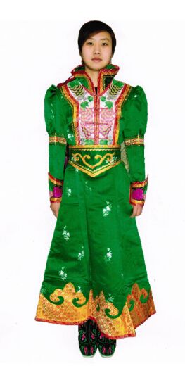 科尔沁蒙古袍款式较合身,长袍下摆窄且开衩。格外注重刺绣装饰、穿偏开襟长坎肩、工艺精湛的尖头靴和已婚妇女发髻式珊瑚头饰等是科尔沁服饰最显著的特征。